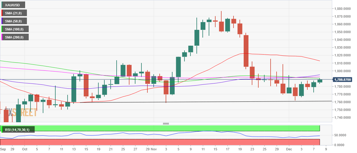 The market mood continues to improve mid-week, exerting downside pressure on the greenback while shoring up gold price to fresh weekly highs above $1,790. Despite the Omicron-related optimism, markets remain anxious ahead of the US inflation reading, reflective of the weakness in the Treasury yields across the curve. Weaker yields further boost the non-interest-bearing bullion. Early Wednesday, a South African study showed that Pfizer Inc.’s shot has shown to have partial effectiveness against the Omicron variant. Looking ahead, in absence of any first-tier US economic data, the Omicron-driven risk sentiment will continue to influence the bright metal. A sudden risk-off move across the market could bump up the dollar’s demand at the expense of gold.