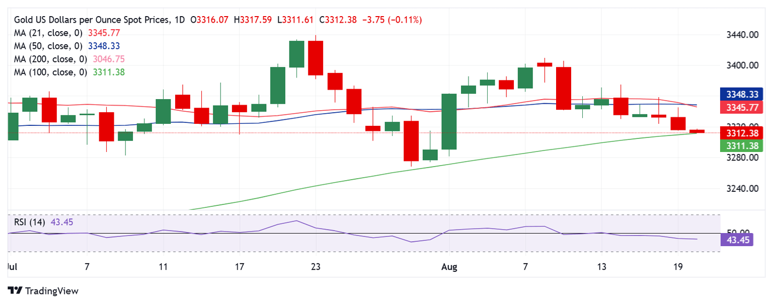 Gold is flirting with three-week lows near $3,300 in Wednesday’s Asian trading as the US Dollar (USD) clings to the previous upswing, bracing for the Federal Reserve (Fed) Minutes later in the day and Friday’s speech by Chair Jerome Powell at the Jackson Hole Economic Symposium.