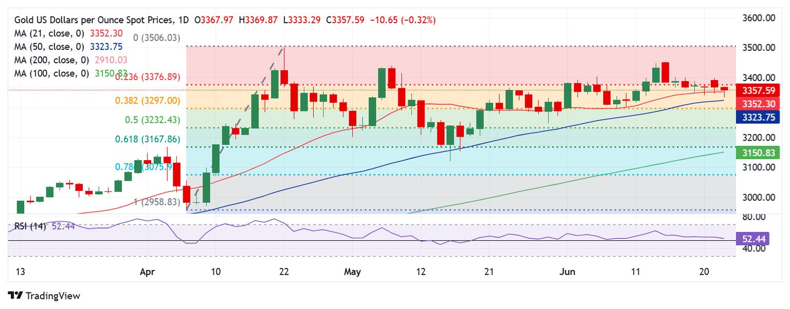The daily chart shows that Gold price is struggling at around the 21-day Simple Moving Average (SMA) at $3,352 on its recovery from nine-day lows of $3,333.