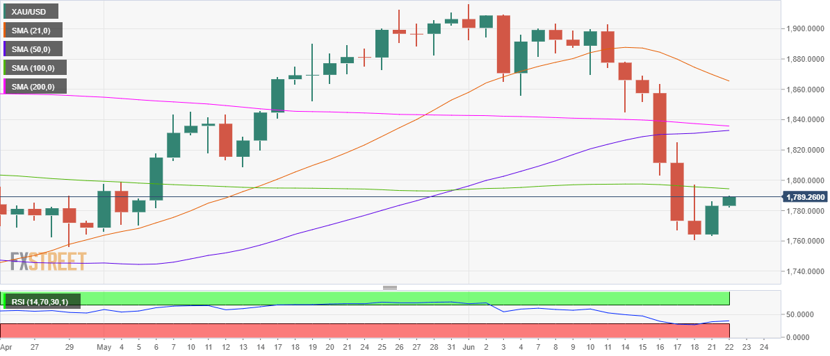 Gold price (XAU/USD) staged an impressive rebound on Monday, snapping a six-day downtrend. Gold jumped as high as $1787 before easing slightly to finish the day at $1783. The choppiness in the US Treasury yields, as the post-FOMC unwinding of reflation trades extended the sell-off in the rates in the Asian session, which lifted gold price from two-month lows. In the second half of the day, the US returns on the market rebounded firmly but at the same time, the US dollar corrected sharply across the board, which helped gold maintain its recovery mode. The risk-on mood amid easing tightening fears amid a slew of Fedspeak added to the pullback in the greenback. Fed policymakers James Bullard, Robert Kaplan and John Williams said that the economy has still room for recovery and therefore, there is still time before withdrawing the stimulus.
