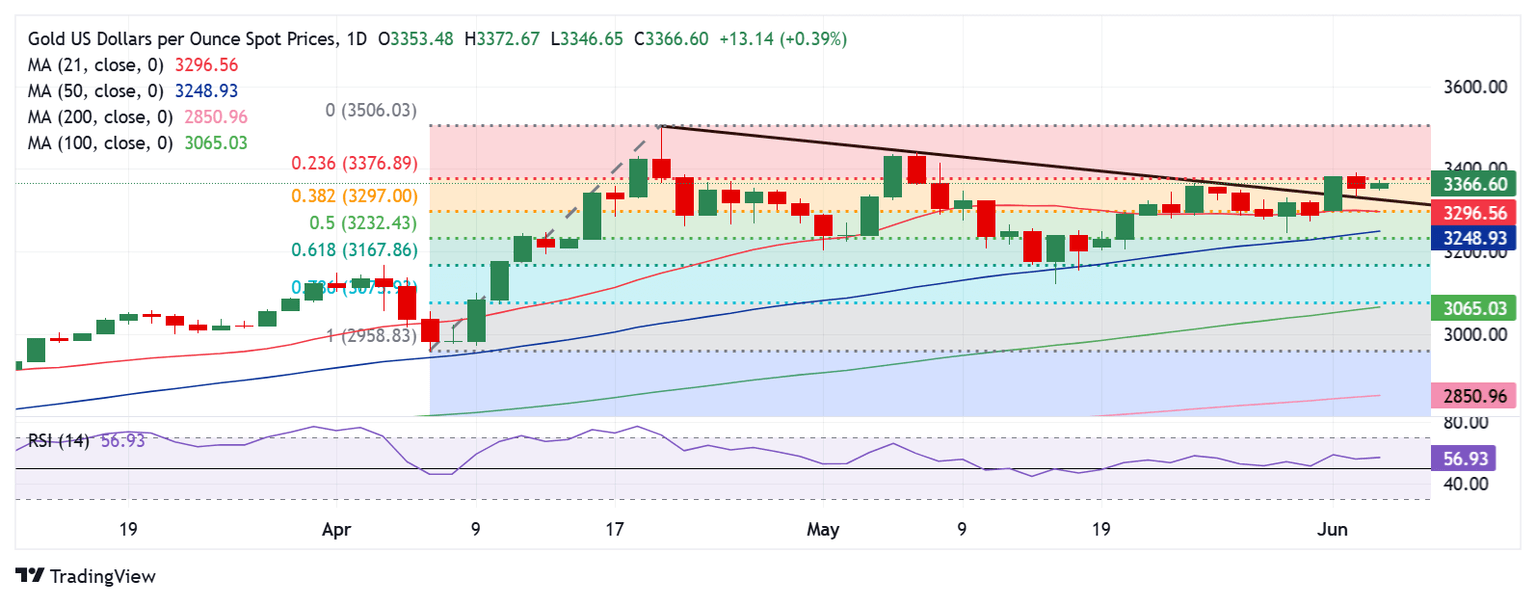 - Gold price retests key resistance zone near $3,377 on the daily chart amid bullish RSI.