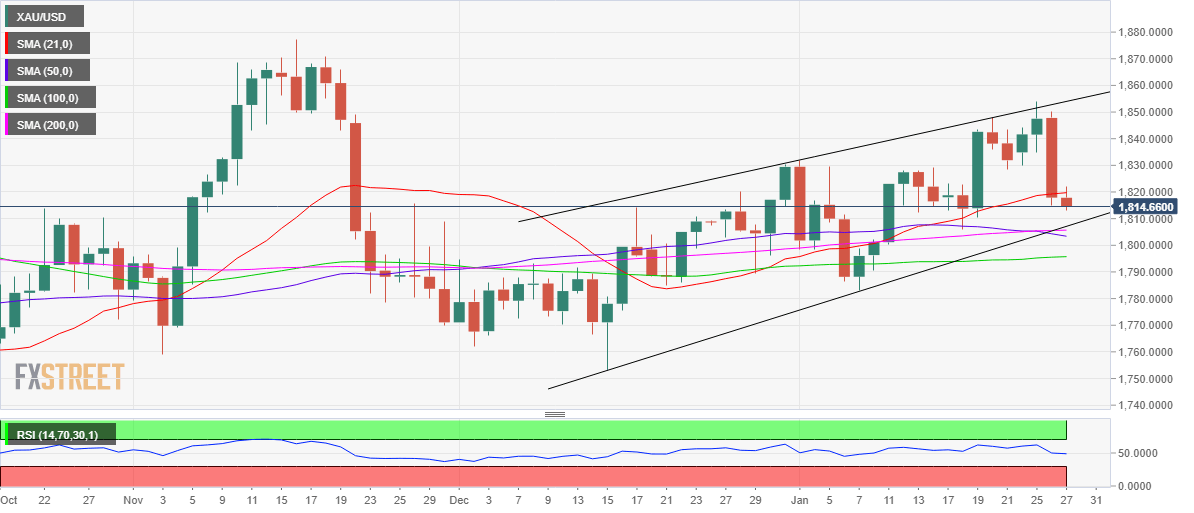 Gold price is licking its wounds near weekly lows of $1,813, as bears take a breather in the aftermath of the Fed decision while waiting for the US advance Q4 GDP and Durable goods data. The US economy is likely to have regained steam in Q4, 2021, as the growth is seen at the best level in 37 years, arriving at 5.4% YoY. The bearish tone around gold remains intact, as the two-year Treasury yields jump to 23-month highs while the ten-year rates hover near-weekly top on the Fed’s hawkish rhetoric. The slump in the Asian stocks combined with the yields-led US dollar strength exacerbates the pain in gold price. Meanwhile, easing geopolitical tensions around Ukraine, especially after the US said it had set out a diplomatic path to address sweeping Russian demands in eastern Europe, weigh negatively on the traditional safe-haven gold.