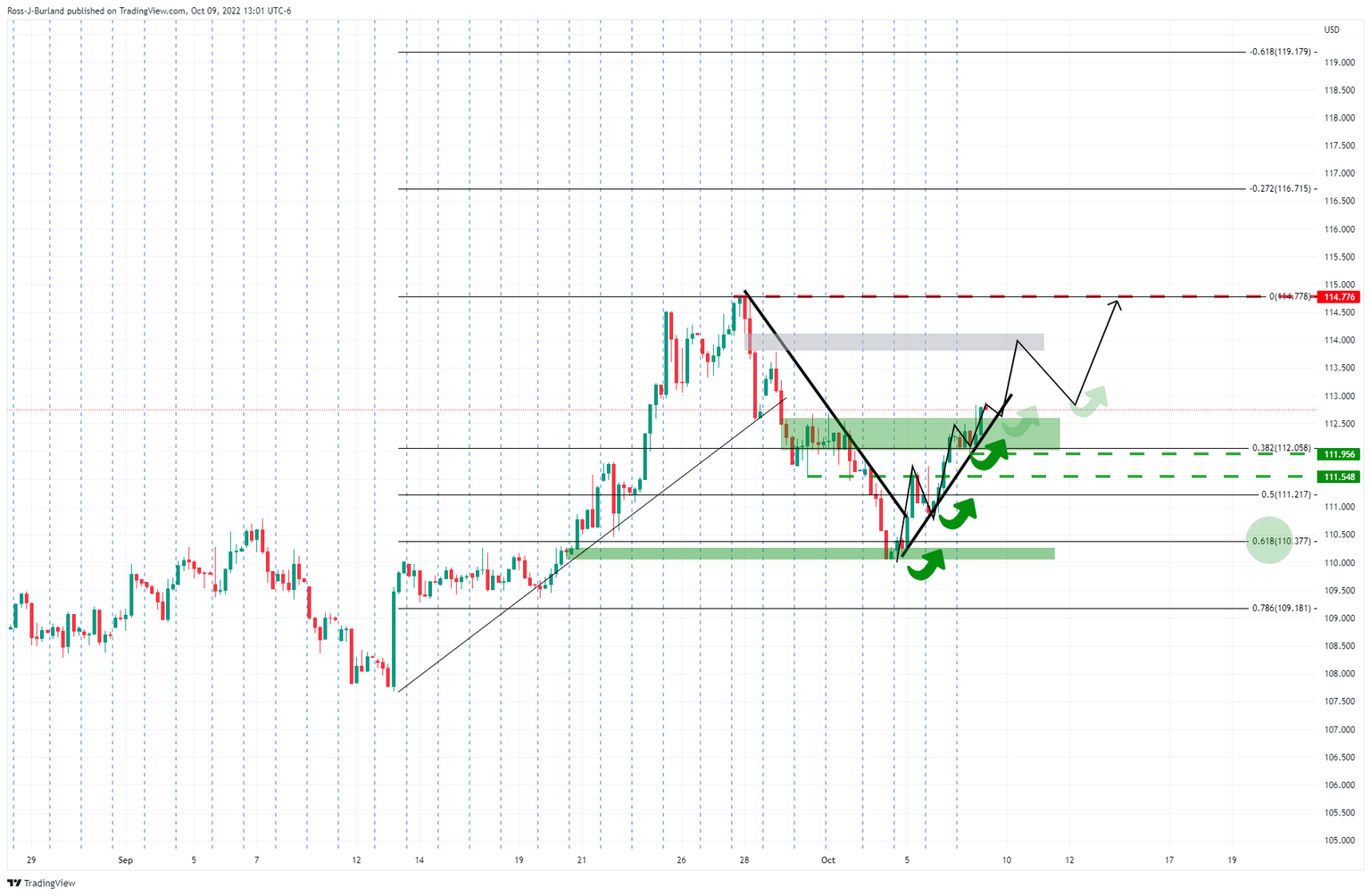 We have seen a 62% retracement in the September rally and an attempt to move higher again on the front side of a dynamic supporting trendline that is yet to give. There is a price imbalance in the grey area around 114.00 that the bulls can target for the week ahead into the Consumer Price Index (CPI).