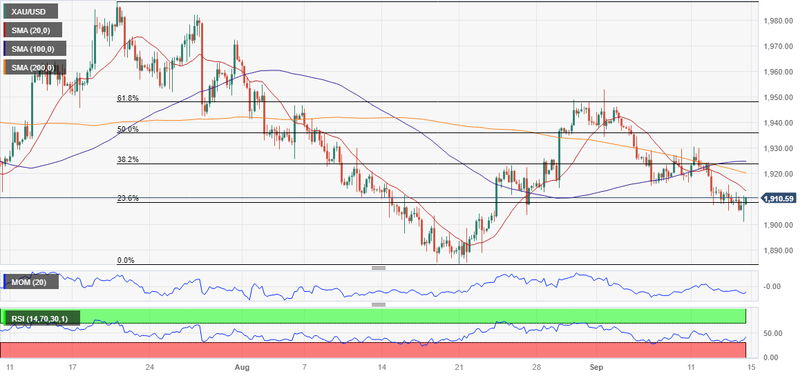The XAU/USD pair is unchanged from its daily opening but posted a third consecutive lower low, which maintains the risk to the downside. In the mentioned time frame, the pair develops below all its moving averages and around the 23.6% Fibonacci retracement of its latest daily slump at 1,907.30. The Momentum indicator, in the meantime, remains directionless around its 100 level, while the Relative Strength Index (RSI) indicator consolidates at around 42, reflecting sellers' dominance.