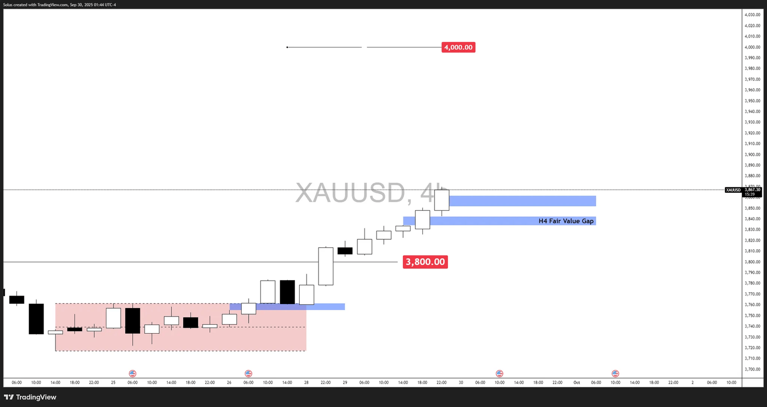 Gold’s breakout above $3,800 has left behind an H4 Fair Value Gap at $3,825–$3,835, which now acts as a potential springboard for further upside. If price pulls back into this zone and finds support, buyers are likely to step back in with conviction.