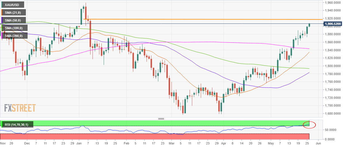 Despite the overbought Relative Strength Index (RSI) on the daily chart, gold buyers defy the bearish odds and remain on track to test the January 8 high of $1917.