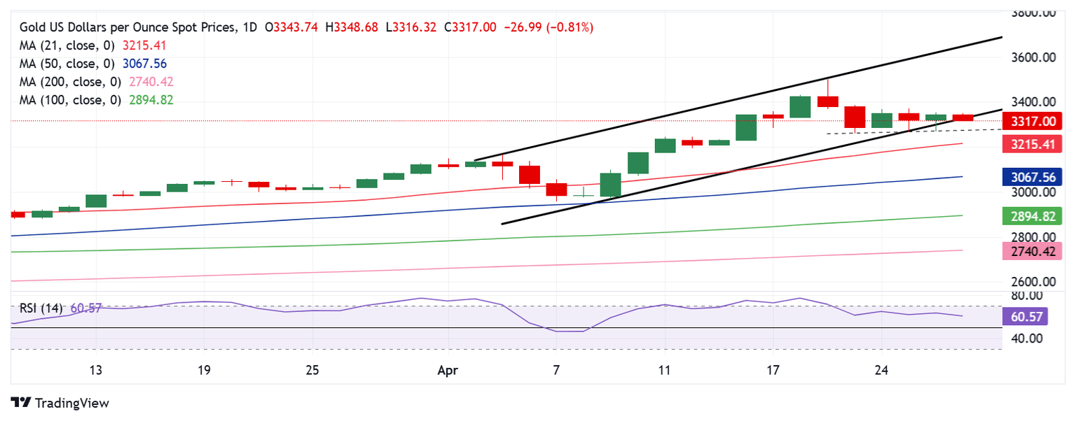 Gold price must close Tuesday below the rising trendline support at $3,300 to validate a rising channel breakdown. The immediate healthy support aligns in the $3,260 region.