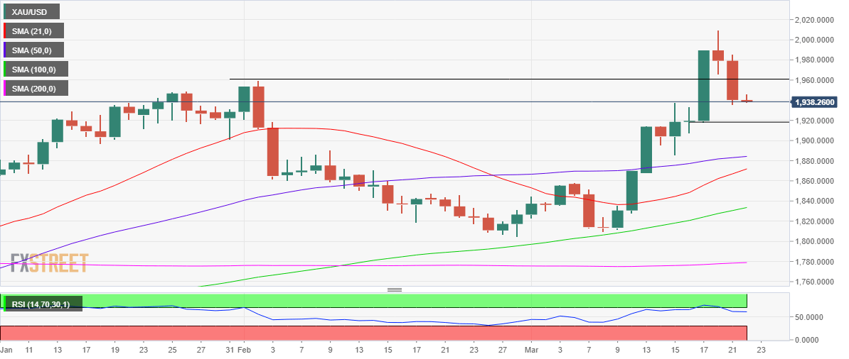 Hawkish Powell could challenge Gold’s bullish commitments at the March 17 low of $1,918 before attacking the $1,900 round level.