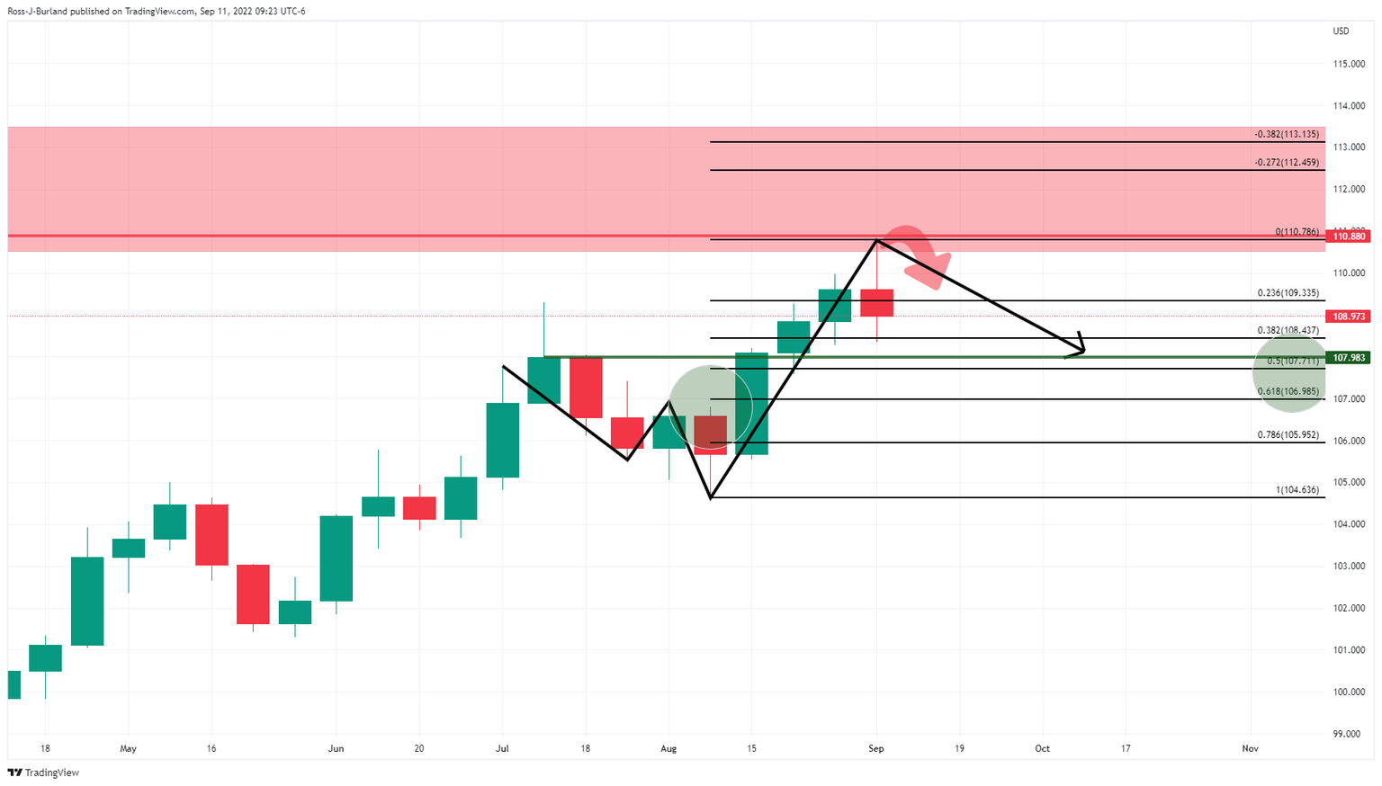 The DXY, an index that measures the US dollar vs. a basket of currencies, has been called at a prior weekly structure near 110.80 and has subsequently started to revert towards the prior closing highs of mid-July in what would be a 50% mean reversion. Thereafter, there is room to the neckline of the W-formation in a 61.8% Fibonacci retracement around 107 the figure. In such a scenario, this would likely support the yellow metal and the following illustrates the bullish thesis on the charts: