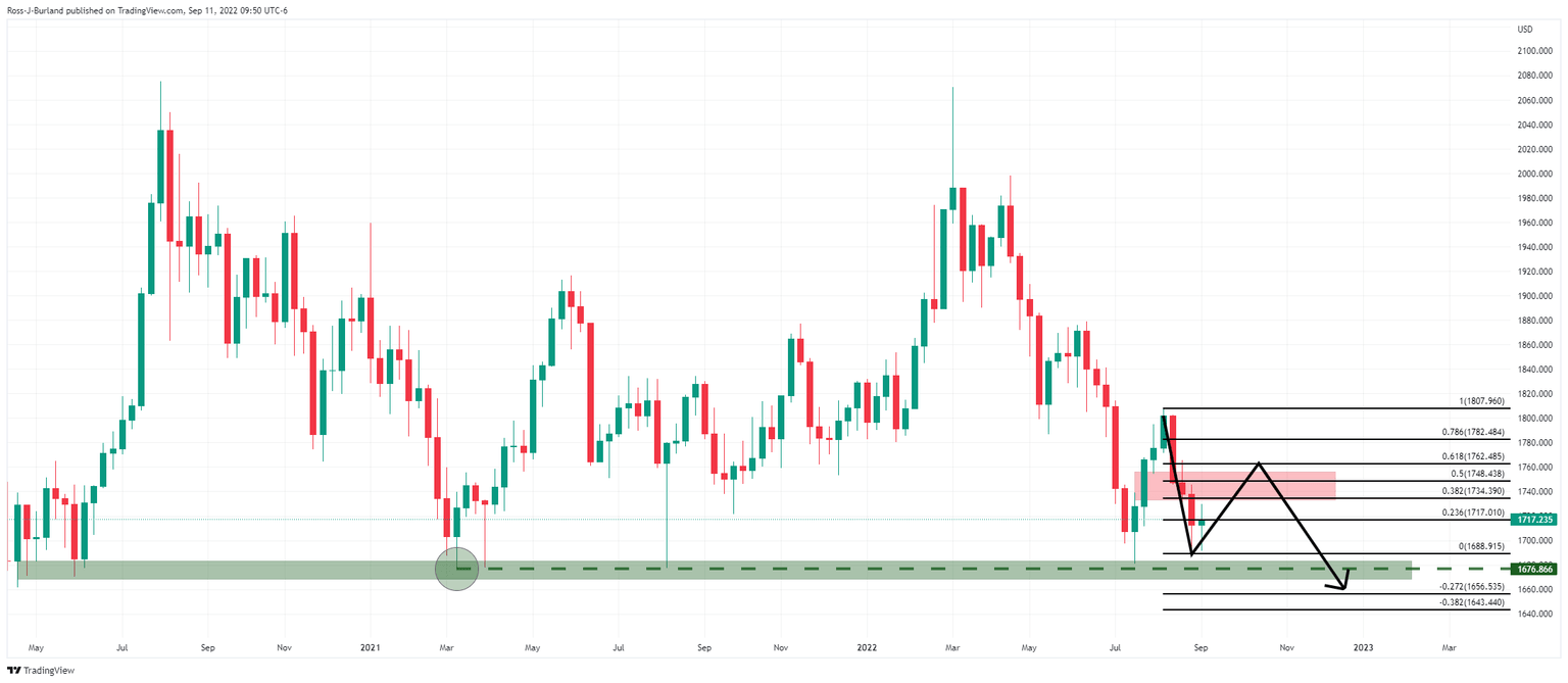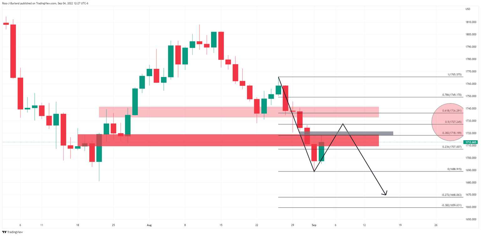 The price was headed towards a price imbalance near $1,721 and beyond there, a 50% mean reversion comes in near $1,727 prior structure. If bears gave ground to the bulls, then the last defence was eyed as being a touch higher around $1,736 as a 61.8% Fibonacci retracement.