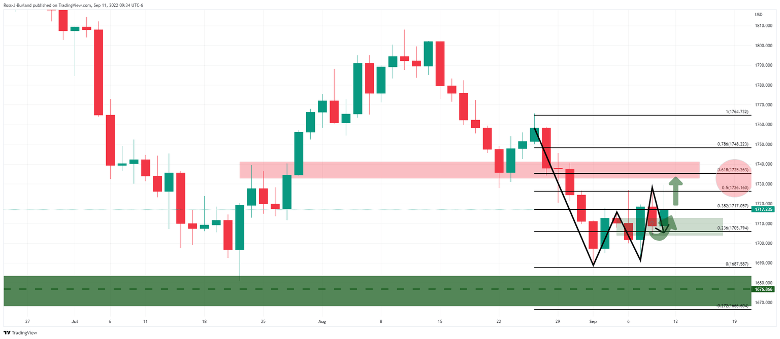 The daily chart has seen the price sweep up the price imbalance around $1,721 and the 50% mean reversion near $1,727 prior structure with a high of $1,729 made so far. A W-formation's neckline has acted as support which leaves prospects for a move higher for the week ahead.