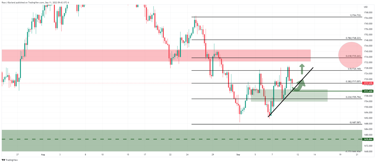 The 4-hour chart's recent low of $1,711 could be important for the opening sessions. So long as bulls can hold on above there, then the structure will remain bullish and favour a move higher towards $1,735 resistance on a break of $1,720.