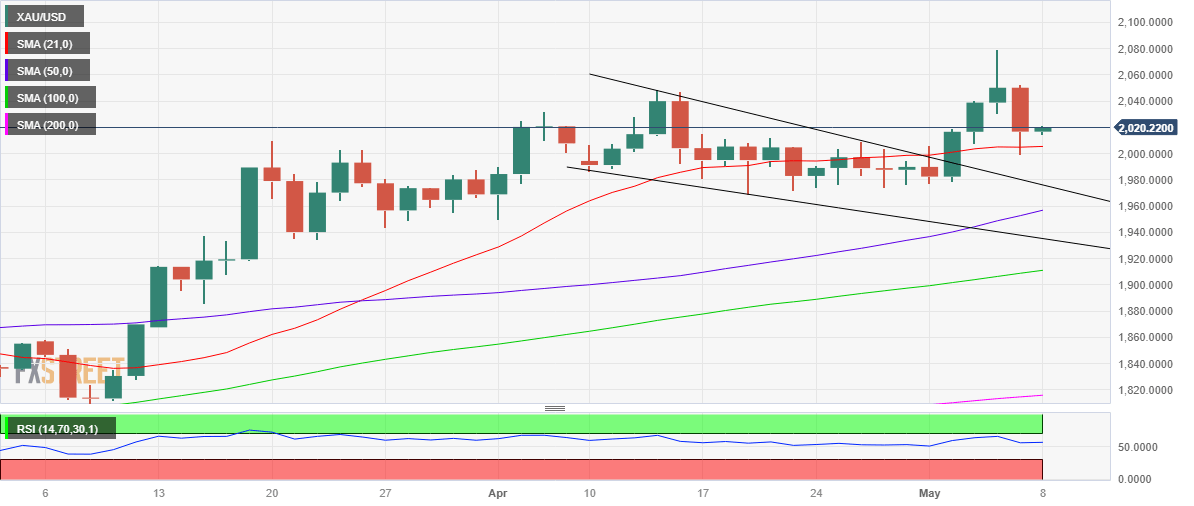 Further, Gold price is receiving some support from the news that the People’s Bank of China (PBOC) bumped up its Gold reserves for the sixth consecutive month. Global Times reported, “China increased its gold reserves for the sixth consecutive month in April to 66.76 million ounces (1,893 tons). China's gold reserves grew 260,000 ounces month-on-month, data from the People's Bank of China showed on Sunday, with 4.12 million ounces of gold being purchased since November 2022.”