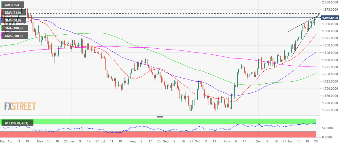 - Gold price bulls take a breather just below $1,950 after the ongoing upsurge.