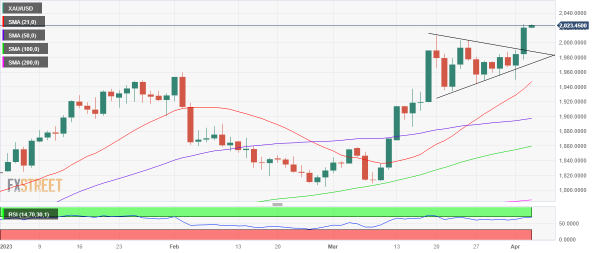 Gold price is sitting at the highest level since March 2022 near $2,025 early Wednesday, extending the previous upsurge amid continued weakness in the United States Dollar across the board. All eyes now remain on the top-tier US economic data and the speeches from the US Federal Reserve (Fed) policymakers for fresh trading impetus.