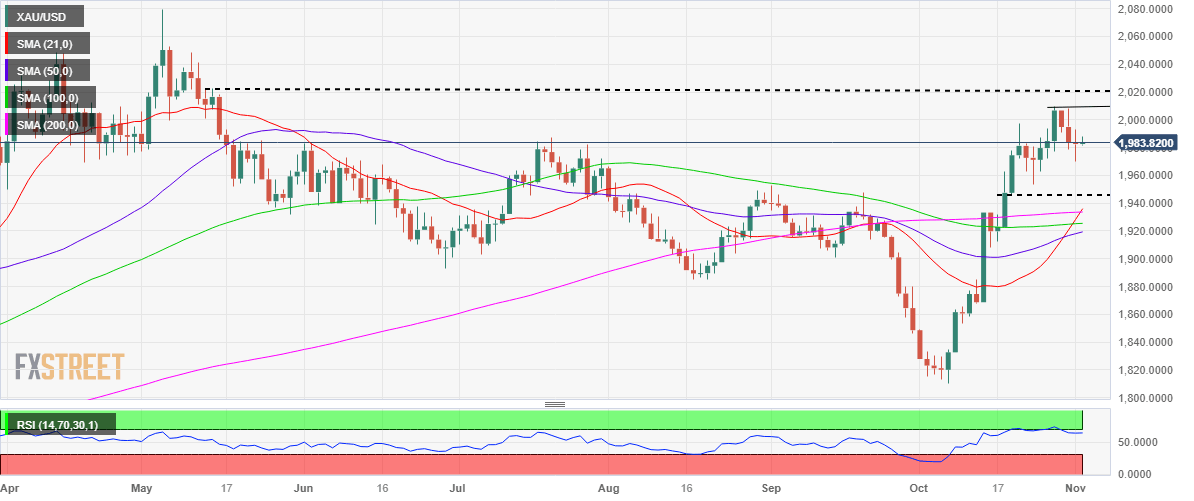 In Thursday’s trading so far, Gold price is building on the previous recovery, as investors weigh the path forward on interest rate by the Fed, with bets for a December and January rate hike pared back and markets pricing in Fed rate cuts as early as June next year. The extension of the Fed-led risk rally on global stocks will likely keep the safe-haven US Dollar undermined, as traders look past the Hamas-Israel conflict in the lead-up to Friday’s US Nonfarm Payrolls data release.