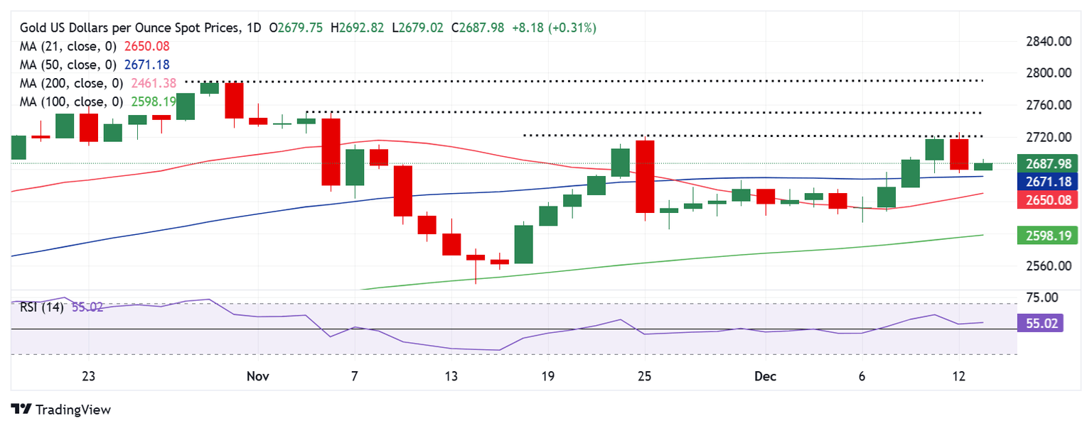 Gold price faced rejection at higher levels on Thursday and turned south before finding support at the 50-day Simple Moving Average (SMA) at $2,671 early Friday.