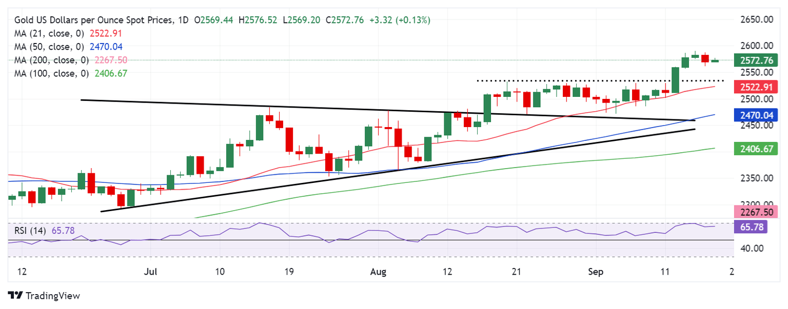 - Gold price could retest lifetime highs at $2,590 amid the bullish daily RSI and while above $2,560.