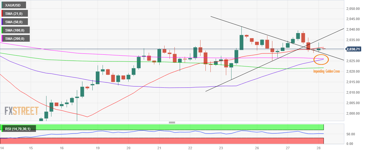 At the moment, Gold price is struggling around the 21-Simple Moving Average (SMA) at $2,033.