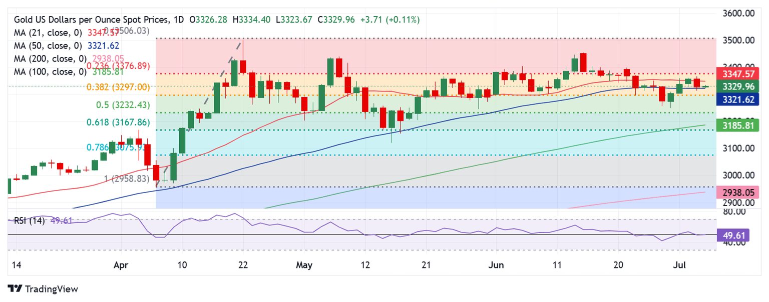 Having faced rejection above the 21-day Simple Moving Average (SMA), then at $3,350, Gold price turned lower, now testing the 50-day SMA support at $3,322.