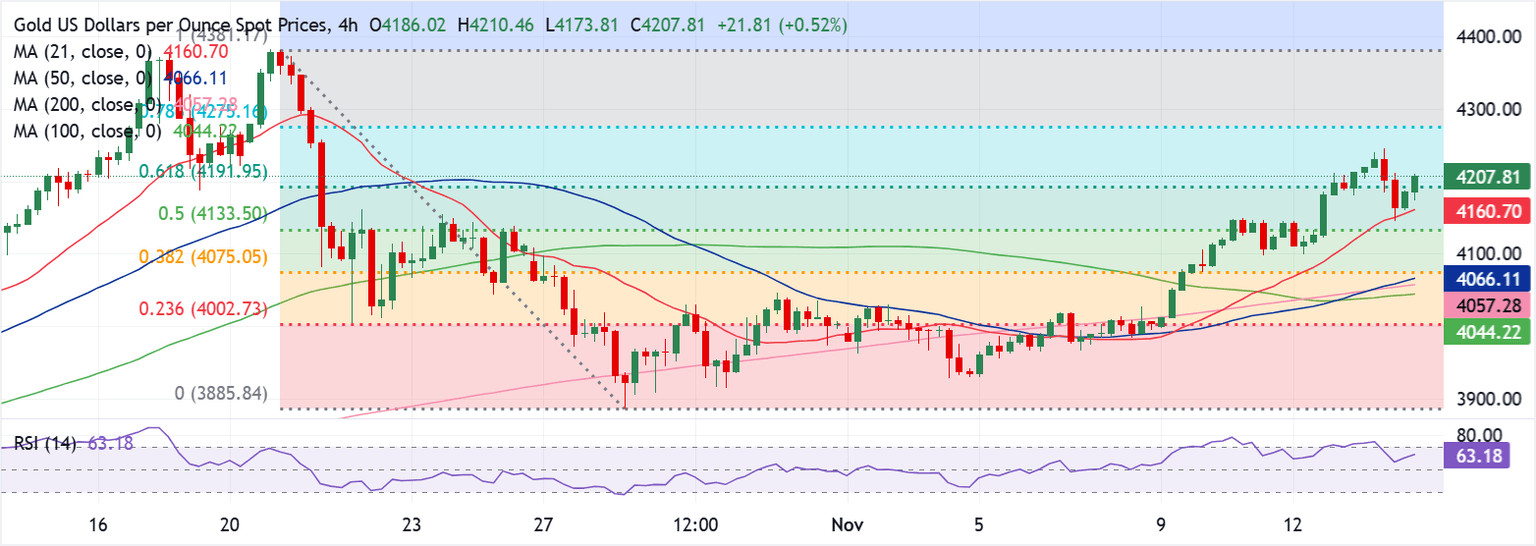 - Gold revisits the $4,200 level early Friday after a sharp pullback, eyes weekly gains.