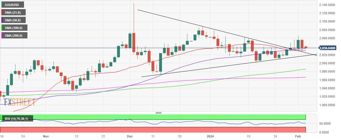 As observed on the daily chart, Gold price managed to close the week above the critical support in the $2,030-$2,035 region, despite a steep correction. That level is the confluence of the triangle resistance-turned-support, 21-day and 50-day Simple Moving Averages (SMA).