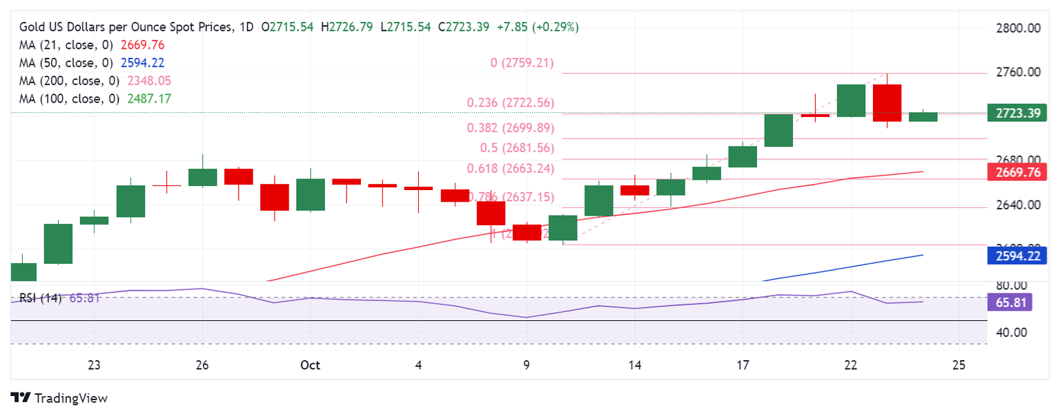 Gold price seems to be facing stiff resistance at $2,723, the 23.6% Fibonacci Retracement (Fibo) level of the latest record rally from the October 10 low of $2,604 to an all-time high of $2,759.