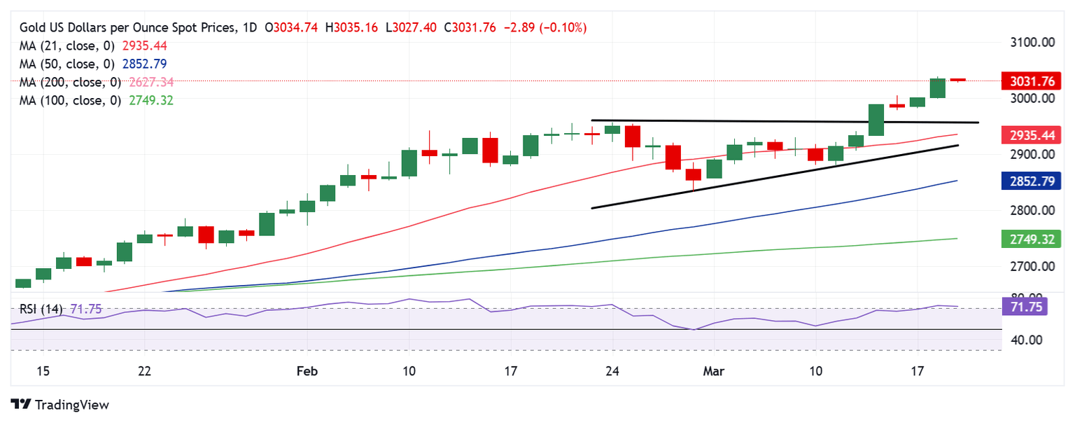 Gold price is consolidating the recent upsurge to a record high of $3,038 in Wednesday’s Asian trading hours. Gold buyers take a breather as a sense of caution prevails, heading toward the all-important US Federal Reserve (fed) monetary policy announcements due later in the day.