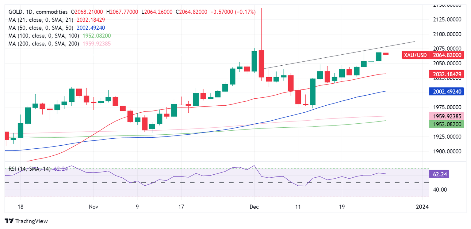 Gold price has returned to the red for the first time in four trading days on Wednesday, pulling back slightly from two-week highs of $2,071 set on December 22.
