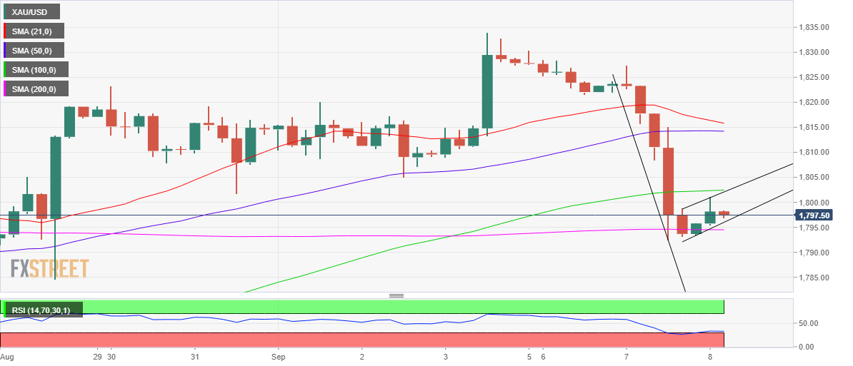 A sustained break below the confluence of the 200-Simple Moving Average (SMA) and rising trendline support at $1795 could confirm the bearish continuation pattern, calling for further downside towards $1760.