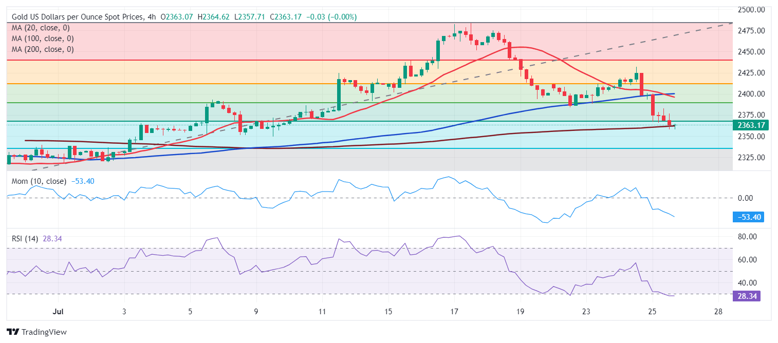 Gold remains under selling pressure on Thursday, trading near a fresh multi-week low of $2,357.92. The bright metal eased throughout the first half of the day amid a dismal market mood. Equities led the way, falling on the back of weak earning reports and a sharp slide in the tech sector. The US Dollar pared gains mid-European session as investors await United States (US) first-tier data.