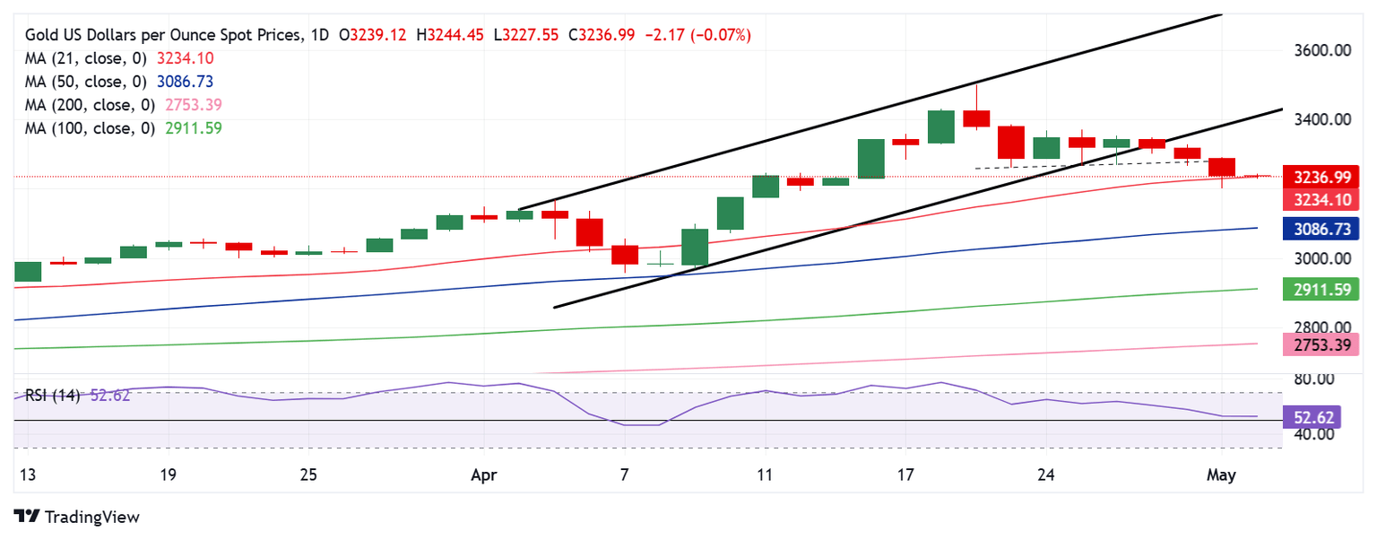 Gold price clings to the critical 21-day Simple Moving Average (SMA) support, now at $3,234, pausing the correction accentuated by the downside break of a three-week-long rising channel on Wednesday.