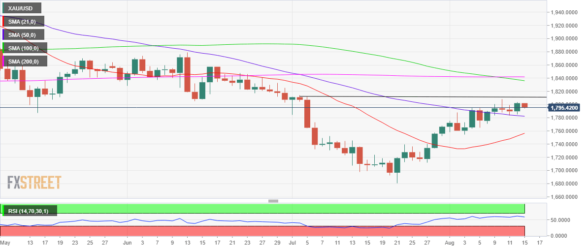 Gold price is reversing Friday’s rebound above $1,800, as bears return at the start of the week. Buyers appear to lack follow-through upside momentum, as souring risk sentiment revives the US dollar’s safe-haven appeal. Chinese July Retail Sales, Industrial Production and Fixed Asset Investment data missed market expectations and triggered a wave of risk-aversion. Further, the unexpected rate cuts by the People’s Bank of China (PBOC) also spooked investors, as the Chinese economic recovery weakens. The broad dollar rebound exerts renewed downside pressure on the USD-priced bullion. Amidst risk-off flows, the demand for government bonds resurges and knocks down the Treasury yields, although the bright metal fails to capitalize on falling yields. Traders also remain cautious, as they continue assessing the Fed’s tightening bets next month following softer US inflation data while brewing American-Sino tensions over Taiwan also keep the dollar supported.