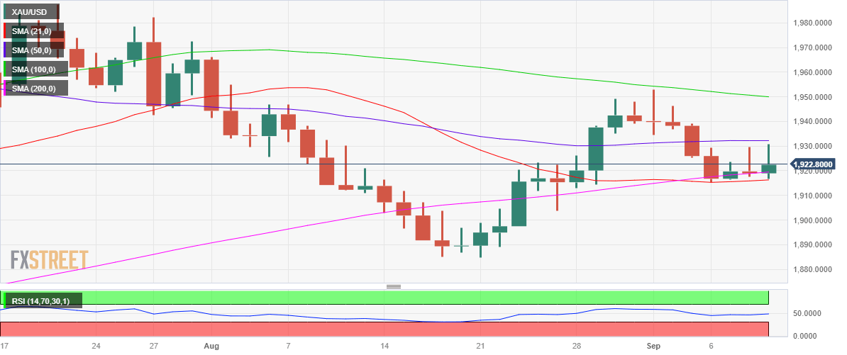 Gold price is treading water while defending the critical 200-Daily Moving Average (DMA) at $1,920 during early Tuesday dealings. Gold price is losing the upside traction as the United States Dollar (USD) finds its feet amid a negative shift in risk sentiment and the buoyant tone seen around the US Treasury bond yields.