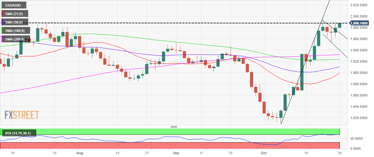 - Gold price challenges key resistance at $1,988 on its way to $2,000.