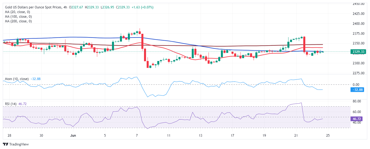 In the near term, and according to the 4-hour chart, XAU/USD offers a neutral-to-bearish stance. The pair develops below all its moving averages, with the 20 SMA flat between also directionless longer ones. Technical indicators, in the meantime, head nowhere just below their midlines. The bright metal traded as low as $2,316.61 on Friday, the level to pierce to expose the $2,300 threshold.
