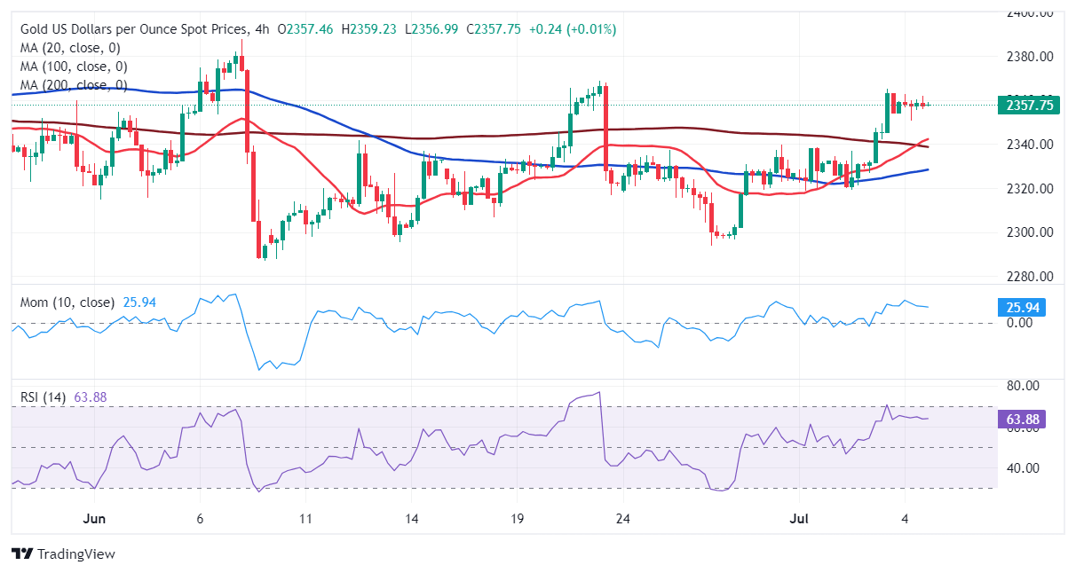Technically, the daily chart shows XAU/USD has remained confined to a tight range near its weekly high of $2,364.83, losing momentum but with the risk still skewed to the upside. The pair is developing above a flat 20 Simple Moving Average (SMA) while the 100 and 200 SMAs keep advancing below it. Technical indicators, in the meantime, remain within positive levels, although without directional strength.