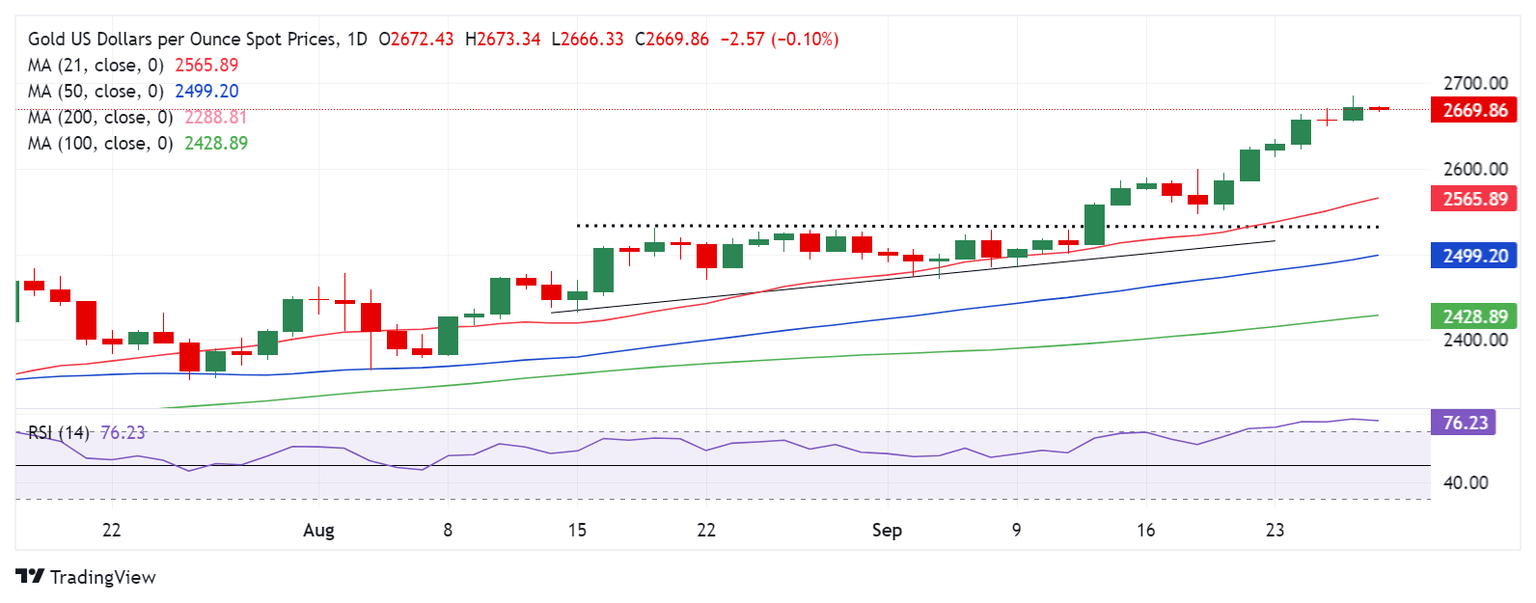 Gold price treads water while within a striking distance of the new record high of $2,686, as buyers take a breather and consolidate the weekly gains in the countdown to the US Personal Consumption Expenditures (PCE) Price Index data release later on Friday.