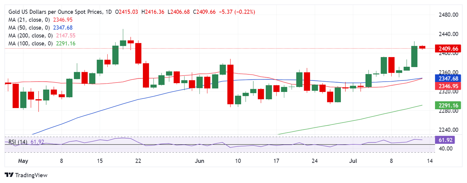 The short-term technical outlook for Gold price continues to suggest a retest of the all-time highs at $2,450, as the 14-day Relative Strength Index (RSI) holds its position well above the 50 level.