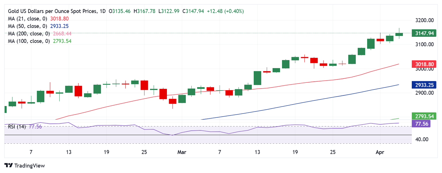 Gold price is correcting sharply from a new record high of $3,168 reached in the early Asian session on Thursday. Despite the pullback, Gold price preserves a significant part of the recent record run, courtesy of escalating risks of a global trade war and a US recession.