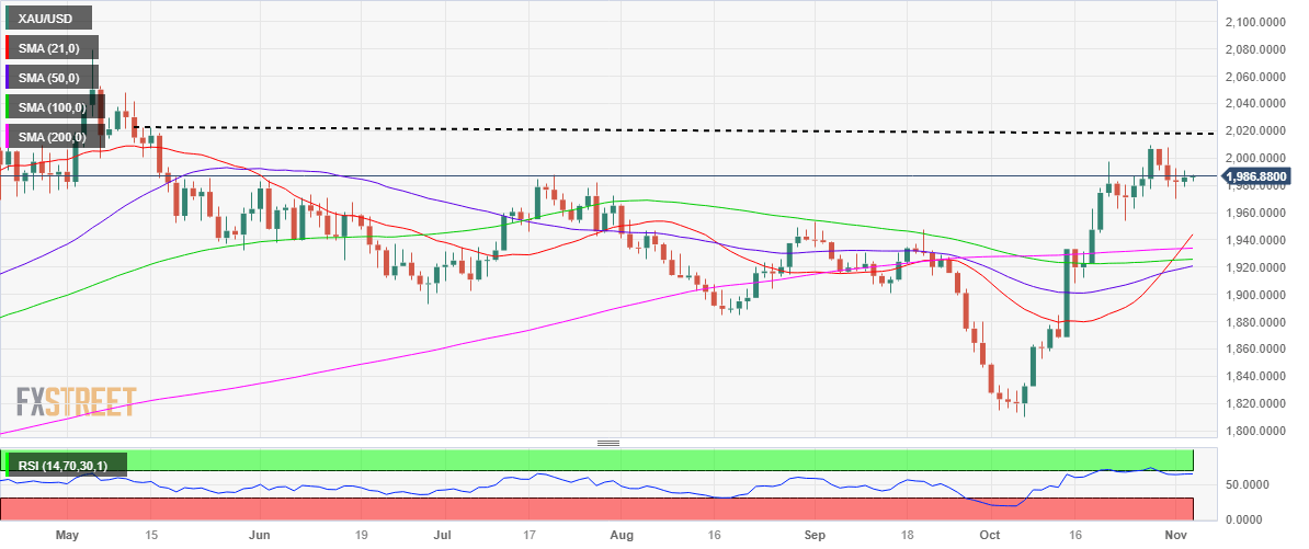 Looking ahead, all eyes remain on the US labor market report, with the key focus on the headline NFP figure, which is foreseen at 180K in October, as against a 336K increase in September. Average Hourly Earnings are seen rising 4.0% in the reported period, compared with a 4.2% increase in September. A weak headline NFP print and soft wage inflation are likely to confirm market expectations that the Fed’s tightening cycle is likely over, triggering a fresh US Dollar selling wave. In such as case, Gold price could see a fresh upside to retake the $2,000 barrier.