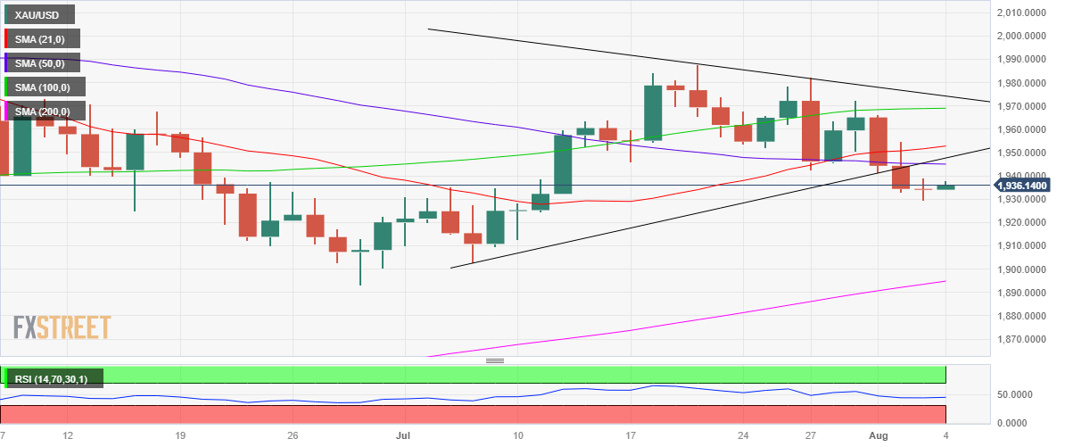 The main focus will be on the headline Nonfarm Payrolls figure, which is seen arriving at 200K, and wage inflation. Average Hourly Earnings are seen rising 4.2% YoY in July against the previous increase of 4.4%. A weak NFP print along with soft wage inflation data will ramp up expectations that the US Federal Reserve (Fed) is close to the end of its tightening cycle, which weighs on the US Dollar and the US Treasury bond yields but prop up Gold price. Conversely, strong US labor market data could revive bets for more Fed rate hikes later this year, fuelling a fresh downtrend in the non-interest-bearing Gold price.