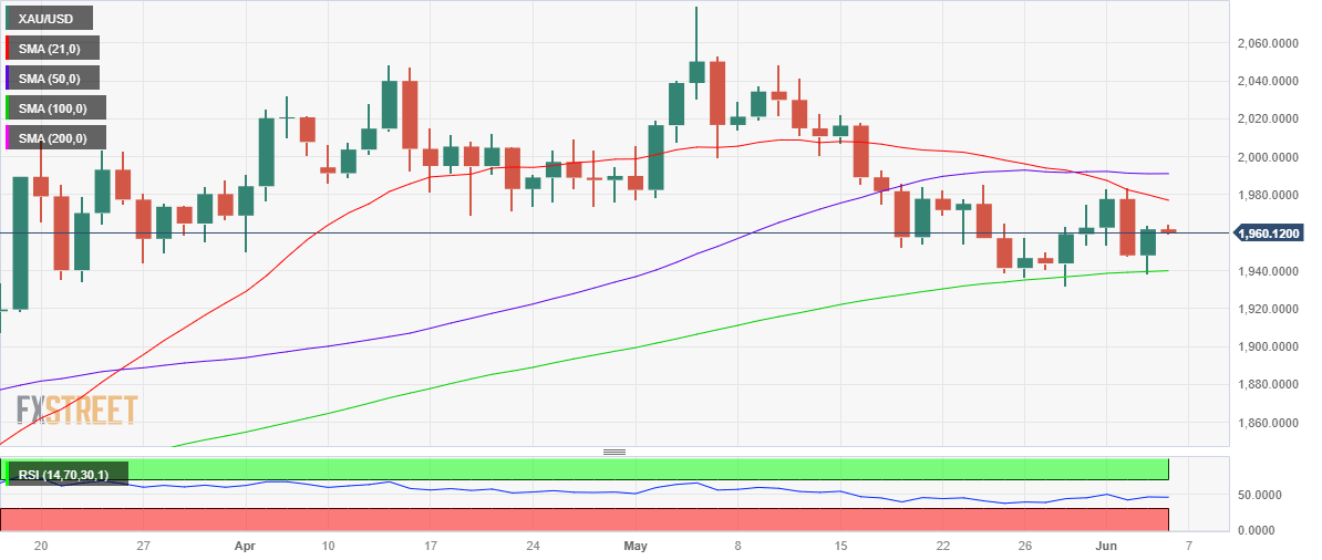 Gold price witnessed good two-way business on Monday, initially losing ground to test the key support near $1,940, only to find strong demand at the latter to recapture the $1,960 round figure. Earlier in the day, the US Dollar held on to the recovery gains, led by a solid US Nonfarm Payrolls report. The NFP report showed that the US economy added 339K jobs in May vs. 190K expected and the upwardly revised previous reading of 294K. The wage inflation component in the jobs report softened to 4.3% while the Unemployment Rate ticked higher to 3.7% in the reported period, compared with expectations of 3.5%.
