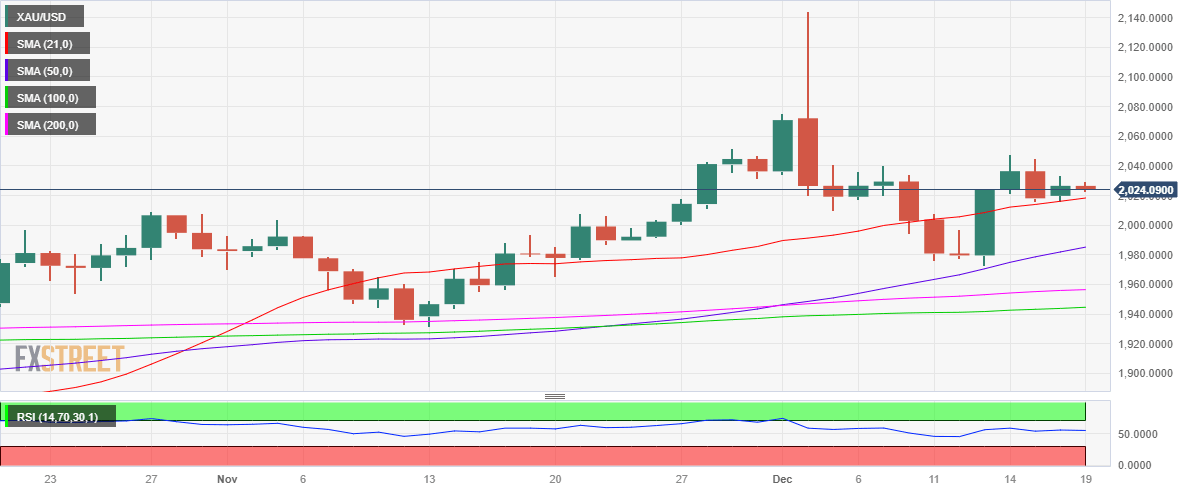 The 14-day Relative Strength Index (RSI) indicator continues to trade above the midline while Gold price defends the 21-day Simple Moving Average (SMA) at $2,016.