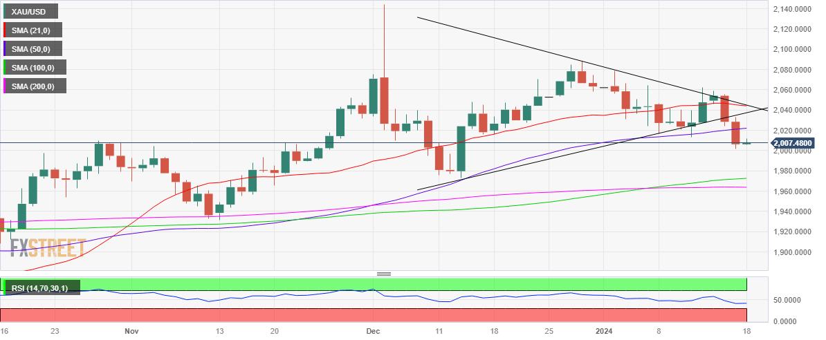 Following Tuesday’s downside break from the triangle and a sustained move below the 50-day Simple Moving Average (SMA), then at $2,021, Gold sellers flexed their muscles to test the $2,000 threshold.