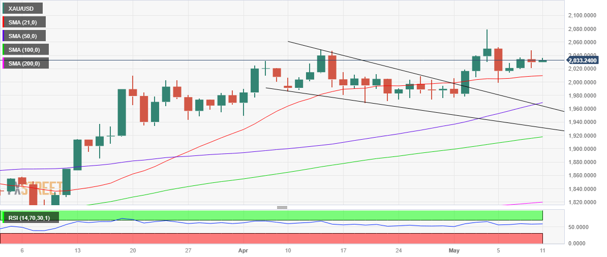 Wednesday’s headline US Consumer Price Index (CPI) data came in softer-than-expected and reinforced confidence in the market that a US Federal Reserve (Fed) rate hike pause in June is a done deal. The US Dollar tumbled with the US Treasury bond yields in an immediate reaction to soft US CPI inflation data, allowing Gold price to break higher and test the $2,050 mark. The US Consumer Price Index rose 4.9% in April YoY but was lower than expectations of a 5.0% increase. Month-over-month CPI in April rose 0.4% after gaining 0.1% in March.