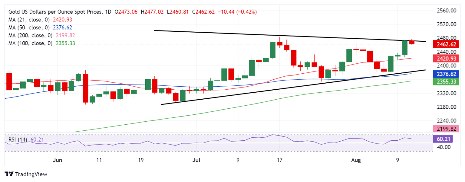 As observed on the daily chart, Gold price accelerated its recovery mode and tested the upper boundary of a symmetrical triangle formation, then pegged at $2,473.