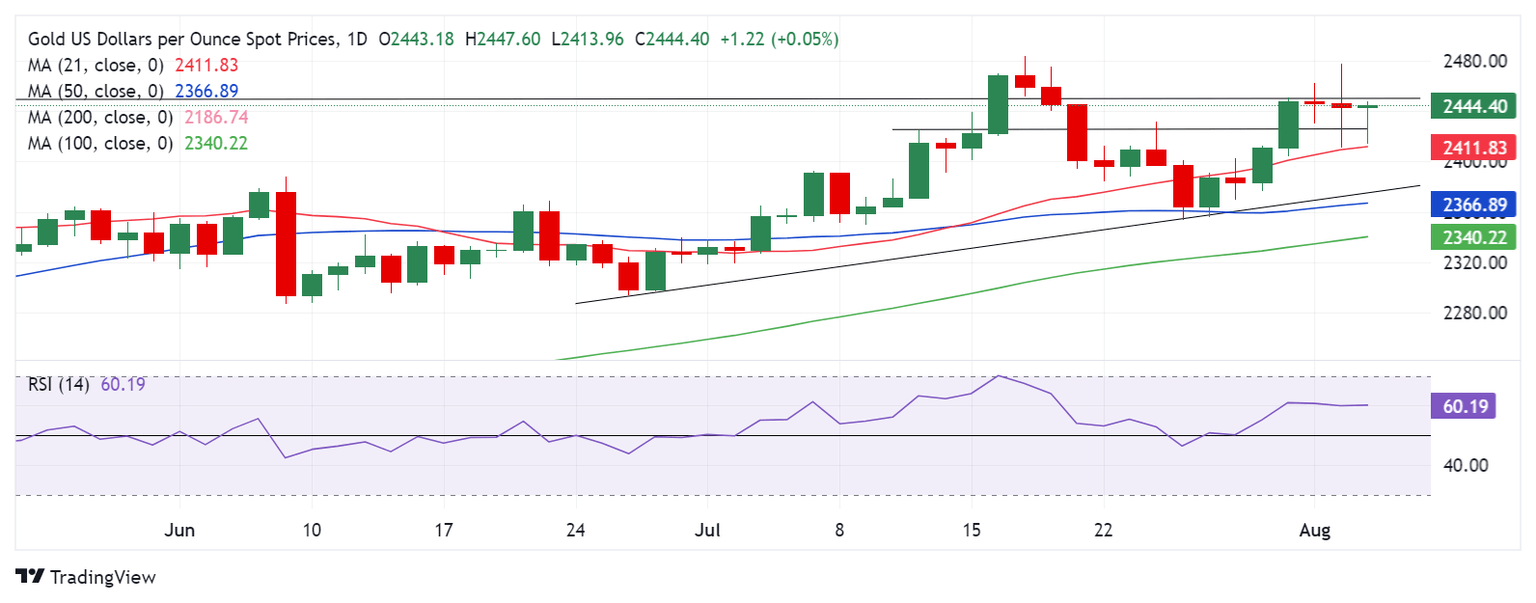 As observed on the daily chart, Gold price needs a daily candlestick close above the previous record highs of $2,450 to successfully resume the uptrend toward the lifetime highs of $2,484, reached on July 17.