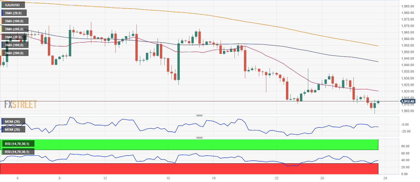 XAU/USD is under selling pressure for a third consecutive day, having traded as low as $1,902.80 early in the American session. The US Dollar gathered strength ahead of Wall Street’s opening as dismal United States (US) data and looming central bankers’ comments put financial markets in risk-off mode.