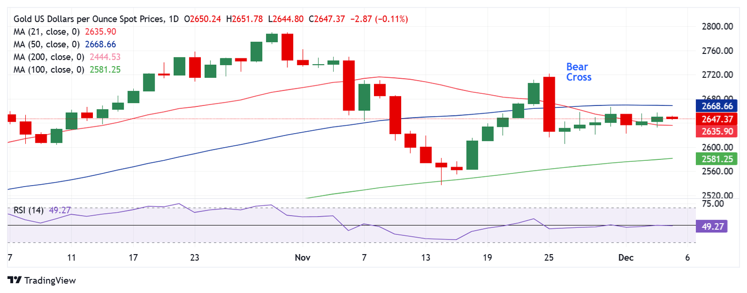 The daily chart shows that Gold's price remains stuck between the critical short-term 21-day Simple Moving Average (SMA) at $2,636 and the 50-day SMA at $2,669.